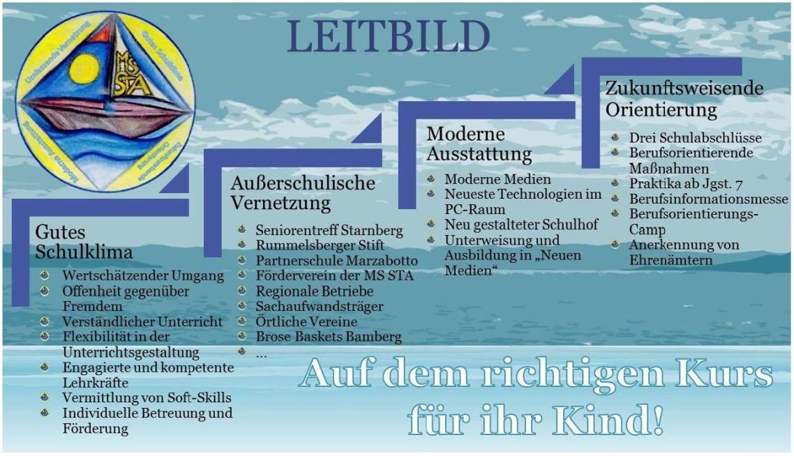 Anbei informiert die folgende Präsentation über das pädagogische Profil, die berufsorientierten Zweige und die verschiedenen Schulabschlüsse der Mittelschule Starnberg. Zudem bietet sie eine Übersicht zu den Bildungswegen und den Voraussetzungen für einen Übertritt nach der 5. oder 6. Klasse.